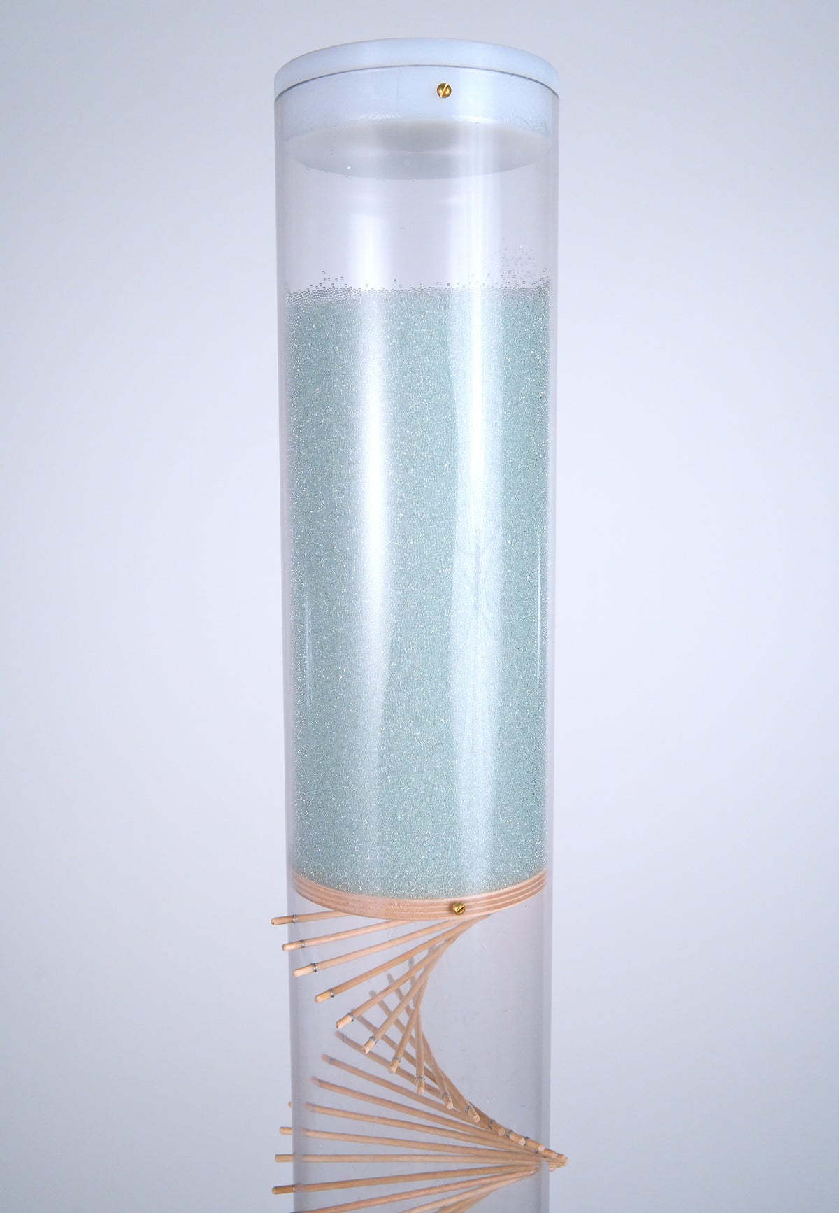 Cylindrical clear tube stands 2’ tall on a white circular pedestal against a white background. The tube has wooden sticks going through it in a spiral pattern, and tan amaranth seed is flowing from the top down to the bottom. The amaranth seeds bounce among the sticks and against the tube and create a gentle rain sound for 3.5 minutes as they descend down the spiral sounds rainstick by Rainstick Dreams.