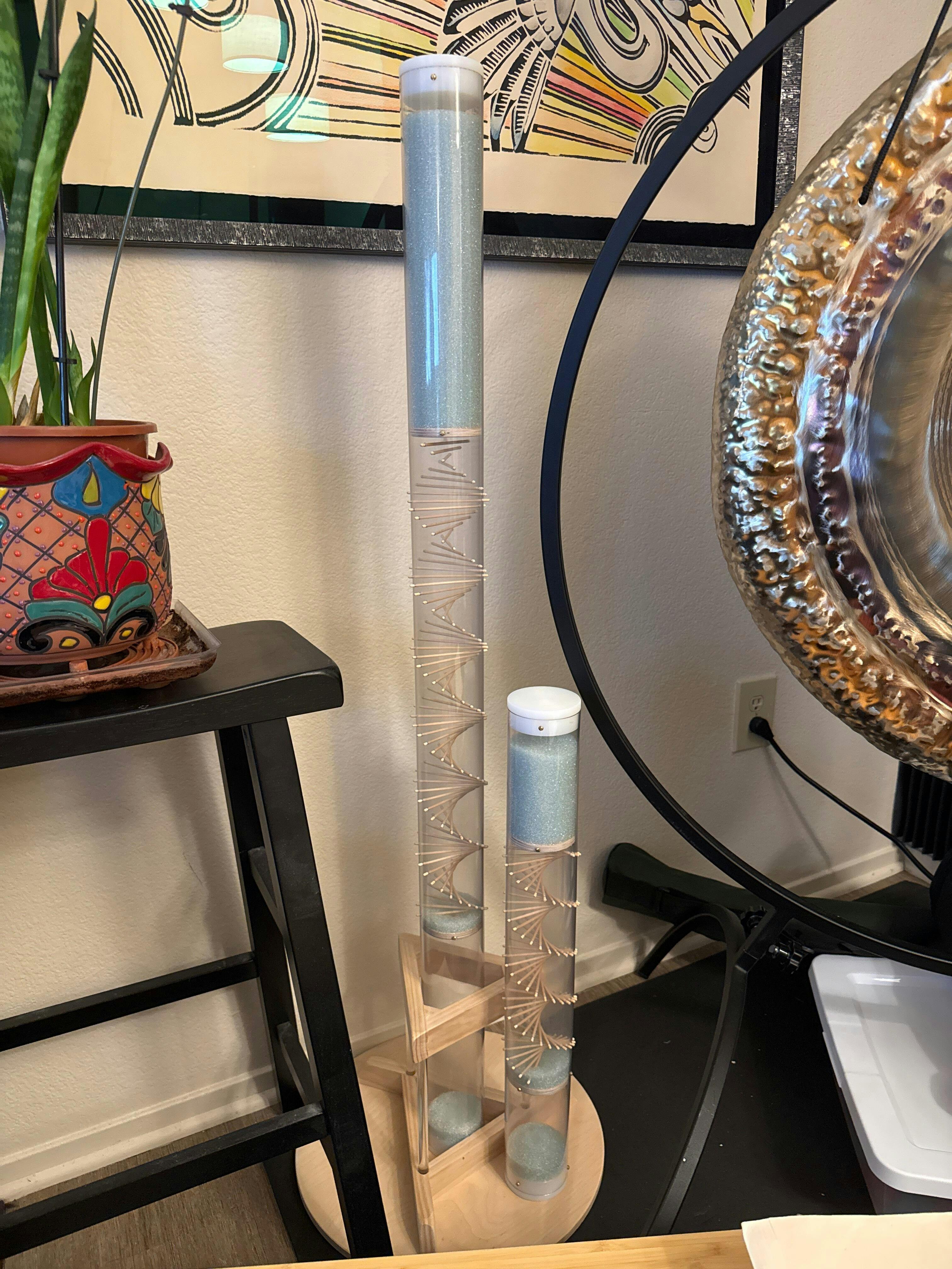 Materials: glass microbeads, plastic tube, birch dowels, plywood circles, plastic caps, metal